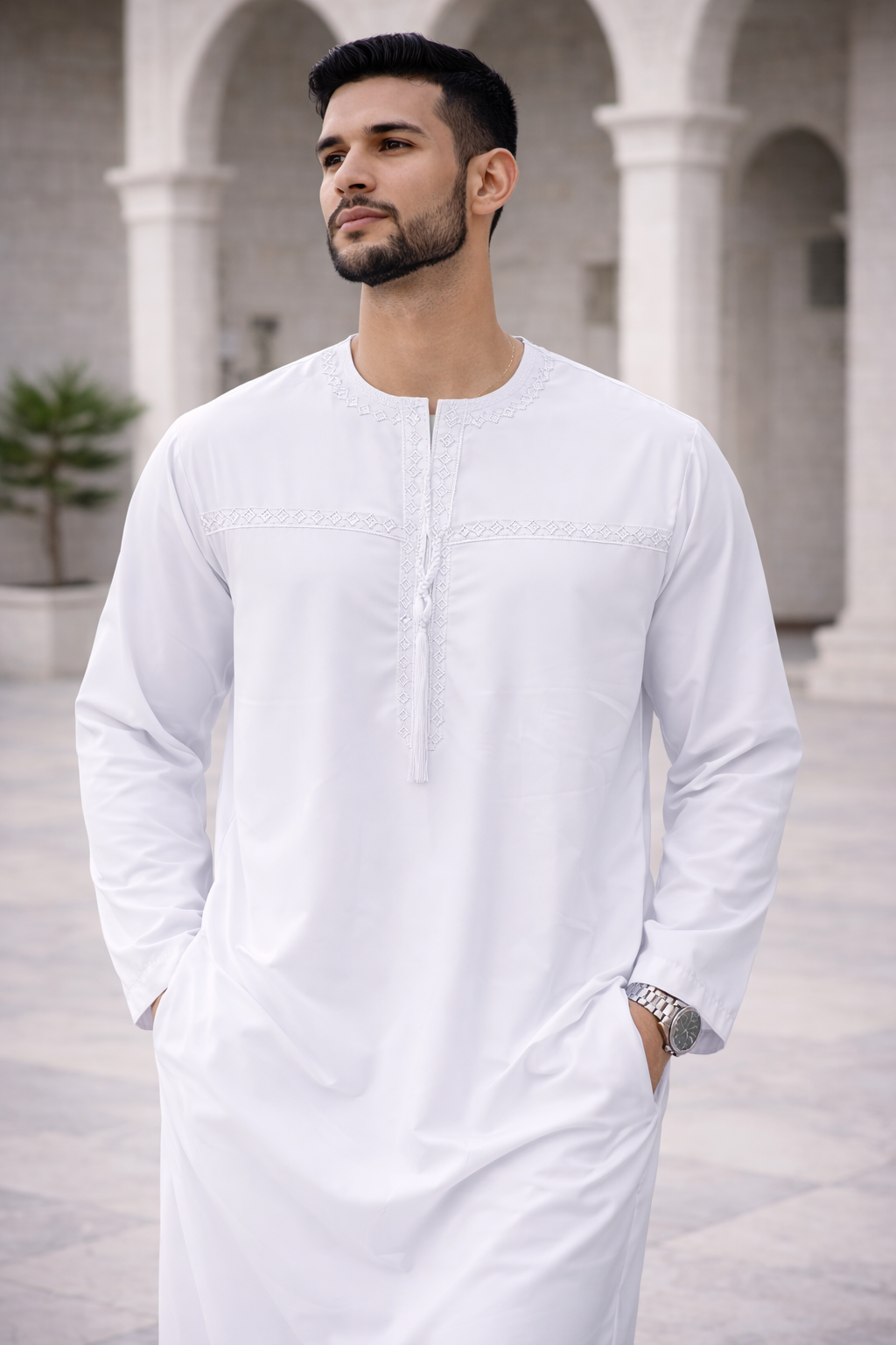Elle épouse les mouvements sans mouler la silhouette, ce qui la rend idéale pour la prière quotidienne, mais aussi pour les tarawih ou les longues stations debout.